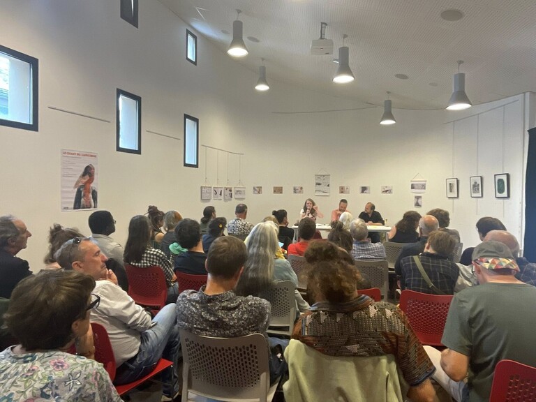Vendredi 7 juin, médiathèque de Laruns (64), l'autrice québécoise Gabrielle Filteau-Chiba et l'auteur Mathieu Larnaudie interrogés par Riccardo Barontini (chaire "Enjeux écopoétiques contemporains", UPPA)
