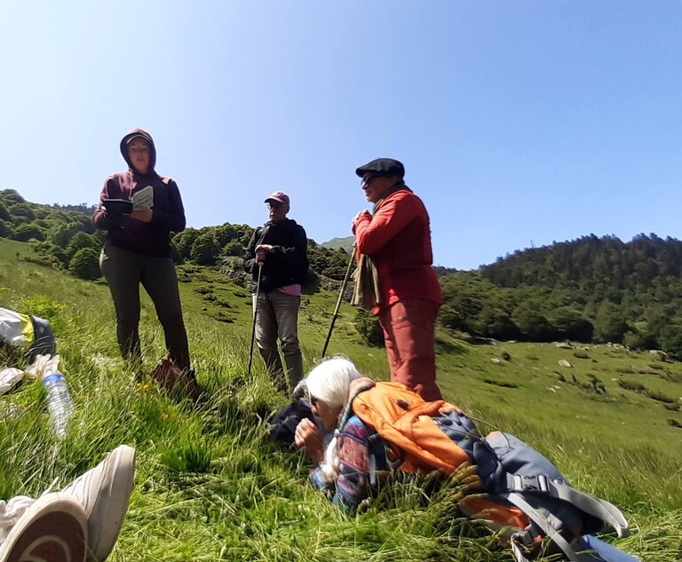 Alan FORTANÉ et Jean SOUST ont racontĂ© un chapelet d’anecdotes savoureuses sur la vie d’estive en VallĂ©e d’Ossau. Ils ont Ă©galement prĂ©sentĂ© les diverses espĂšces de rapaces qui cohabitent, dissertĂ© inĂ©vitablement sur les enjeux de la prĂ©sence de l’ours, en se remĂ©morant notamment les dĂ©licats Ă©pisodes de rĂ©introduction et les rĂ©actions qu’ils ont suscitĂ©. Des comparaisons ont pu ĂȘtre effectuĂ©es avec les relations homme/nature dans d’autres contrĂ©es connues par les auteurs comme au QuĂ©bec ou au Maroc grĂące aux auteurs prĂ©sents. Sur le chemin du retour, des moments de lecture en plein air ont scandĂ© la balade, sous les grands hĂȘtres, au son des cloches, avec le consentement bienveillant des troupeaux tout juste montĂ©s Ă  l’estive. Karin HUET et Gabrielle FILTEAU CHIBA ont lu des extraits de leur dernier ouvrage, tandis que Marie GUICHETEAU (titulaire d’une maitrise de Lettres Ă  l’UPPA en sus de son doctorat en gĂ©ographie) a lu des extraits de Parmi les arbres (Actes Sud, 2024) d’Alexis JENNI, in abstentia.
