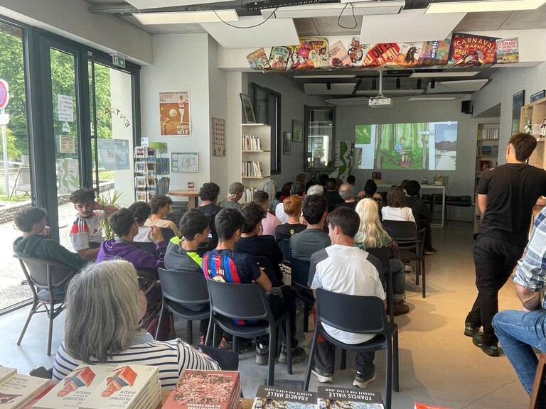 AprĂšs avoir visionnĂ© l'extrait d'un sujet rĂ©cent de France 2 consacrĂ© au naturaliste français Francis HallĂ©, figure Ă  laquelle est consacrĂ©e l’ouvrage de Jenni (Un naturaliste sur le toit de la forêt, Paulsen, 2024), les Ă©lĂšves du lycĂ©e des mĂ©tiers de la montagne de Soeix d’Oloron Sainte-Marie ont pu poser leurs questions Ă  l’écrivain, pour Ă©clairer et approfondir leur comprĂ©hension de l’ouvrage Un naturaliste sur le toit de la forĂȘt qu’ils avaient Ă©tudiĂ© en classe sous la direction de leur professeur Jean-Michel LANOT (Ă©galement secrĂ©taire gĂ©nĂ©ral adjoint du festival).