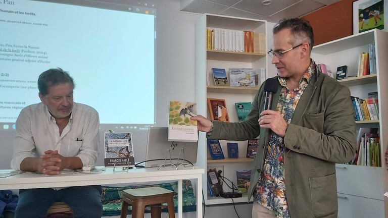 Retour sur le jeudi 5 juin à La Ciutat (Pau) avec les élèves du Lycée des métiers de montagnes Soeix d'Oloron et leur professeur Jean-Michel Lanot pour accueillir Alexis JENNI (Goncourt 2011, prix ELN récit/essai 2022 et 2025); "Perché pour mieux observer le monde: l'humain et les forêts" autour de sa biographie de Francis Hallé (Paulsen, 2024). Le train de notre invité accusait 30 minutes de retard ? Qu'à cela ne tienne; présentation d’Alexis Jenni et Francis Hallé par Jean-Michel Lanot, diffusion d'un extrait de documentaire récent ("La magie des arbres", France 2, 22', 2025, lien ci-dessous) sur le parcours de Francis Hallé, quizz de deux questions aux élèves sur le documentaire avec 1 livre offert par l'association Ecrire la Nature au premier étudiant trouvant la bonne réponse. Et comme par enchantement Alexis Jenni arriva pile à la fin de ce temps.