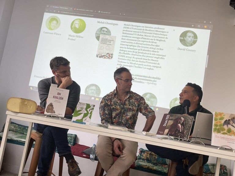 📾 Mehdi Ghouirgate (Professeur, UniversitĂ© de Bordeaux) Ă©voquant l'histoire longue de la culture amazigh ("berbĂšre") au Maroc, en compagnie de Vincenç JavaloyĂšs (politique culturelle de l'occitanisme en France) et du modĂ©rateur.