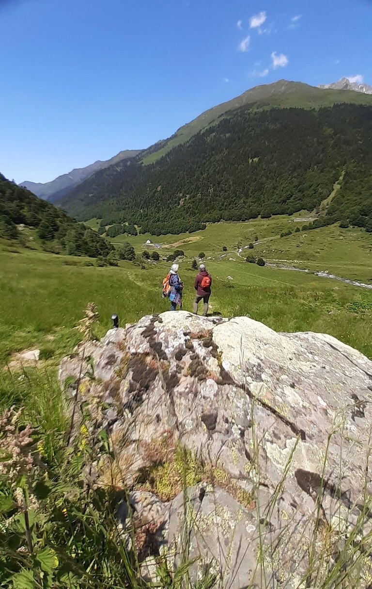 Ils ont appris Ă  reconnaĂźtre les cromlechs, ces cercles de pierre plurimillĂ©naires au sujet desquels les historiens Ă©laborent de multiples hypothĂšses. Les connaissances botaniques de Jean Soust ont guidĂ© la dizaine de randonneurs vers la reconnaissance des plantes locales (myrtilliers, orchidĂ©es sauvages, serpolet). À un rythme lent favorable Ă  la contemplation et Ă  la lecture paysagĂšre, ils ont longĂ© le ruisseau du Brousset et rejoint les premiĂšres pentes qui surplombent la cabane du caillou de Soques, oĂč nous avons profitĂ© du panorama tout en nous restaurant.