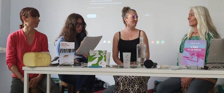 📾 Marie Guicheteau (Docteure en gĂ©ographie, professeure de Lettres Ă  Oloron) et Nessa Garrigou (Licence Lettres de l'UPPA et Master MĂ©tiers du livre de l'IUT de Bordeaux) interrogent Karine Huet et Gabrielle Filteau Chiba