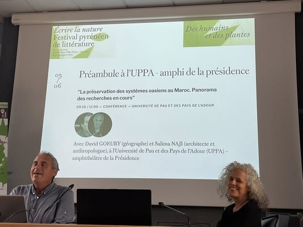 C’est Ă  l’amphithéùtre de la PrĂ©sidence de l’UPPA qu’ont eu lieu les premiĂšres confĂ©rences inaugurant l’évĂ©nement. Deux spĂ©cialistes de la gĂ©ographie et de la culture marocaines, David GOEURY et Salima NAJI (gĂ©ographe pour le premier, architecte et anthropologue pour la seconde) nous ont fait l’honneur de rejoindre le campus palois afin de partager les rĂ©sultats de leurs trĂšs riches recherches de plus d’un quart de siĂšcle en particulier dans le Sud marocain.