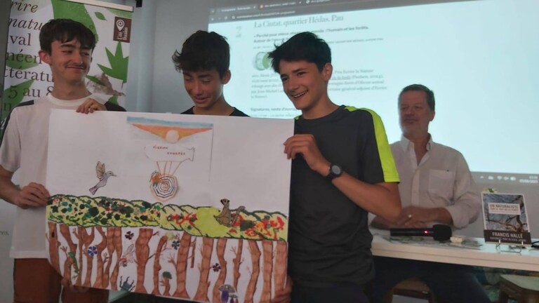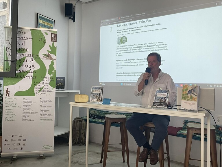 Retour sur le jeudi 5 juin à La Ciutat (Pau) avec les élèves du Lycée des métiers de montagnes Soeix d'Oloron et leur professeur Jean-Michel Lanot pour accueillir Alexis JENNI (Goncourt 2011, prix ELN récit/essai 2022 et 2025); "Perché pour mieux observer le monde: l'humain et les forêts" autour de sa biographie de Francis Hallé (Paulsen, 2024). Le train de notre invité accusait 30 minutes de retard ? Qu'à cela ne tienne; présentation d’Alexis Jenni et Francis Hallé par Jean-Michel Lanot, diffusion d'un extrait de documentaire récent ("La magie des arbres", France 2, 22', 2025, lien ci-dessous) sur le parcours de Francis Hallé, quizz de deux questions aux élèves sur le documentaire avec 1 livre offert par l'association Ecrire la Nature au premier étudiant trouvant la bonne réponse. Et comme par enchantement Alexis Jenni arriva pile à la fin de ce temps.